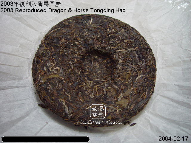 Apart from collecting traditional Zhongcha Brand Seven-son Tea Cakes, i.e. those Aged Seven-son Tea Cakes with at least 20 to 30 years of age, Cloud also collected some Non-zhongcha Brand tea cakes with good aging potential. Even though the tea cakes are from small factories or without any celebrity, it can still offer a good sensation and aftertaste after many years of aging as long as they are compressed from good tea leaves with great aging potential.       In 2004, Cloud collected a stack of 2003 Reproduced Dragon & Horse Tongqing Hao. What attracted Cloud were its thick and soft tea cake (not too compressed) with many intact tea leaves. Besides, it offered a great thick tea broth at the first time when Cloud tasted it. After 6 years of aging, it shows an amber color in the tea broth. Cloud remembered that it was just a light yellowish liquor when Cloud had it 6 years ago.